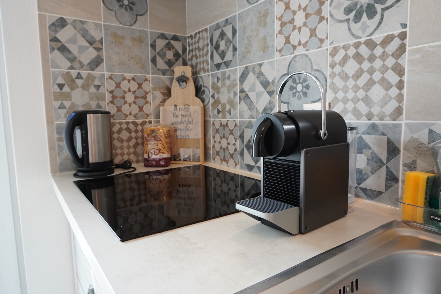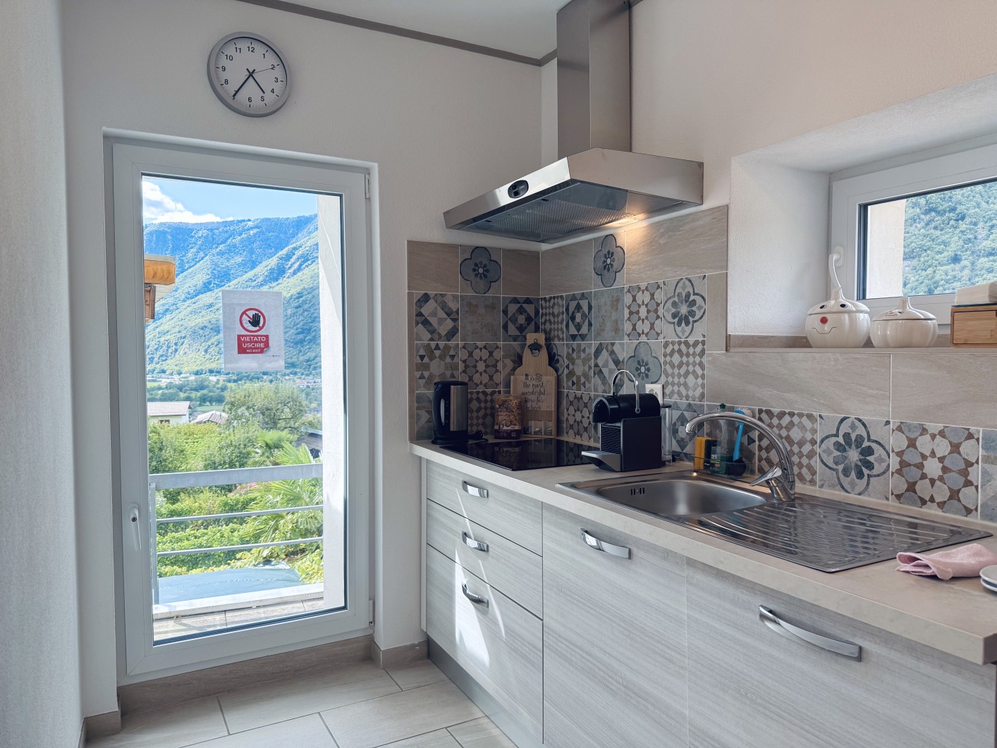 L’appartamento è dotato di una cucina a induzione che comprende elettrodomestici moderni come piano cottura, microonde, frigorifero e capienti armadi per la conservazione di utensili da cucina e provviste.