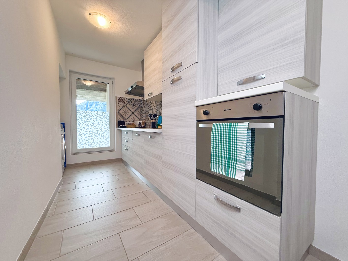L’appartamento è dotato di una cucina a induzione che comprende elettrodomestici moderni come piano cottura, microonde, frigorifero e capienti armadi per la conservazione di utensili da cucina e provviste.