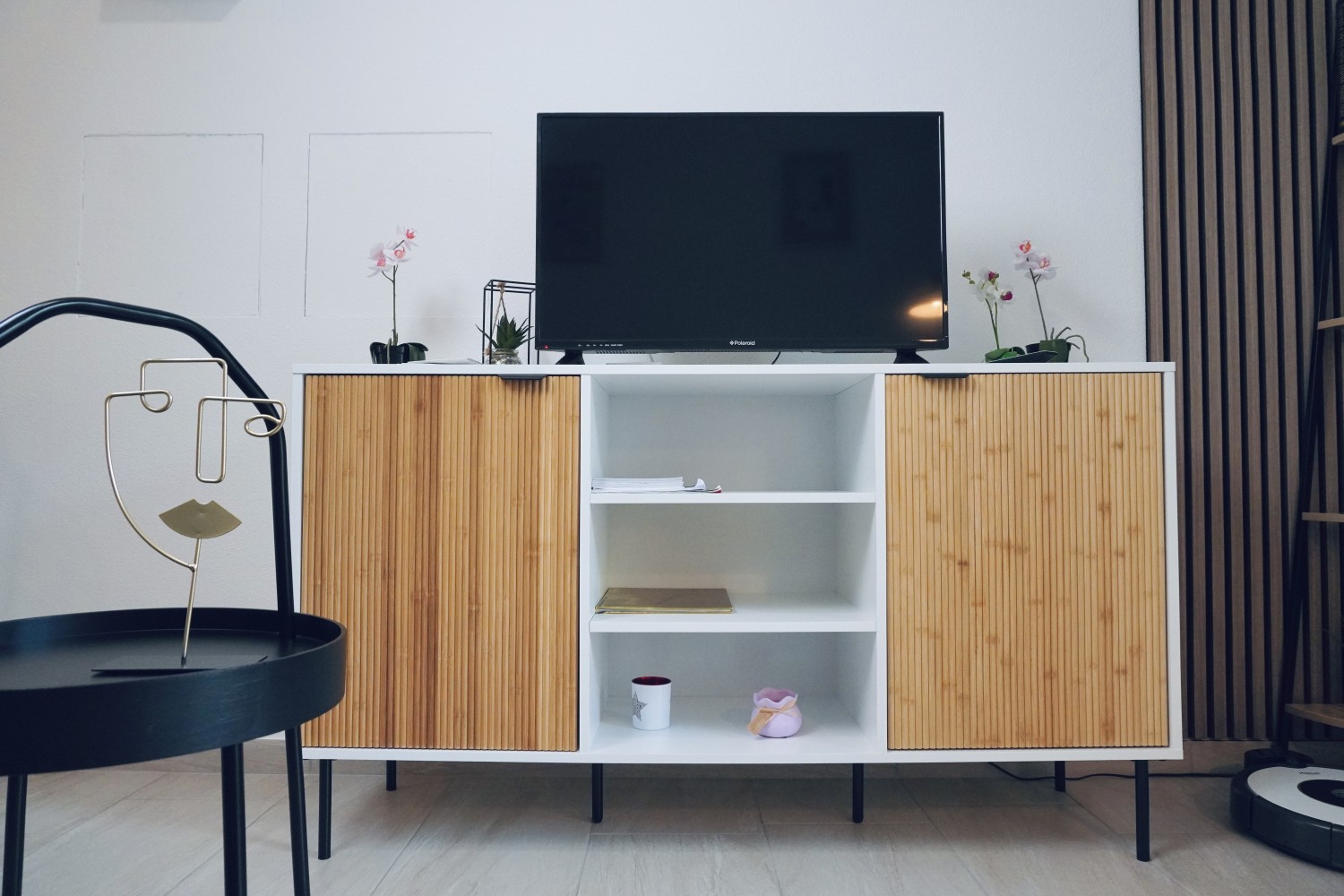 La zona principale è dotata di un letto a scomparsa integrato che durante il giorno rimane invisibile e si trasforma in un pratico divano. Accanto si trova un elegante angolo living con un divano imbottito e un televisore a schermo piatto montato a parete, ideale per rilassarsi.