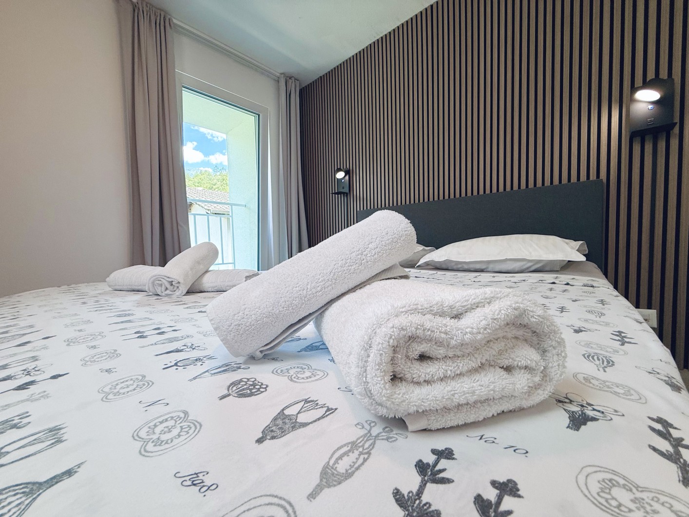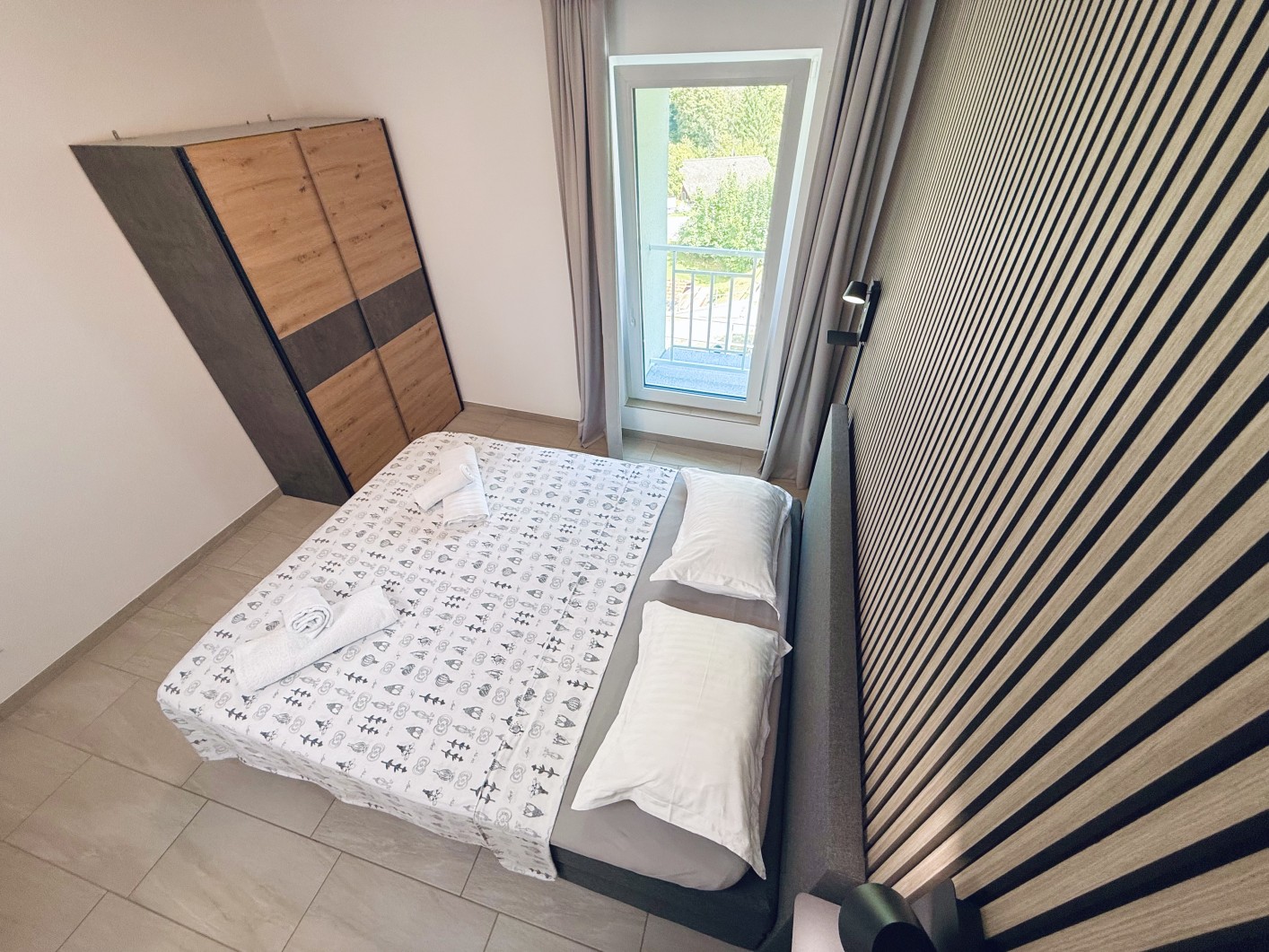 Der Hauptbereich des Zimmers umfasst ein geräumiges Doppelbett mit einer bequemen Matratze, die angenehme Erholung garantiert. Das Bett ist strategisch platziert, um den verfügbaren Platz zu optimieren, ohne den Komfort zu beeinträchtigen.