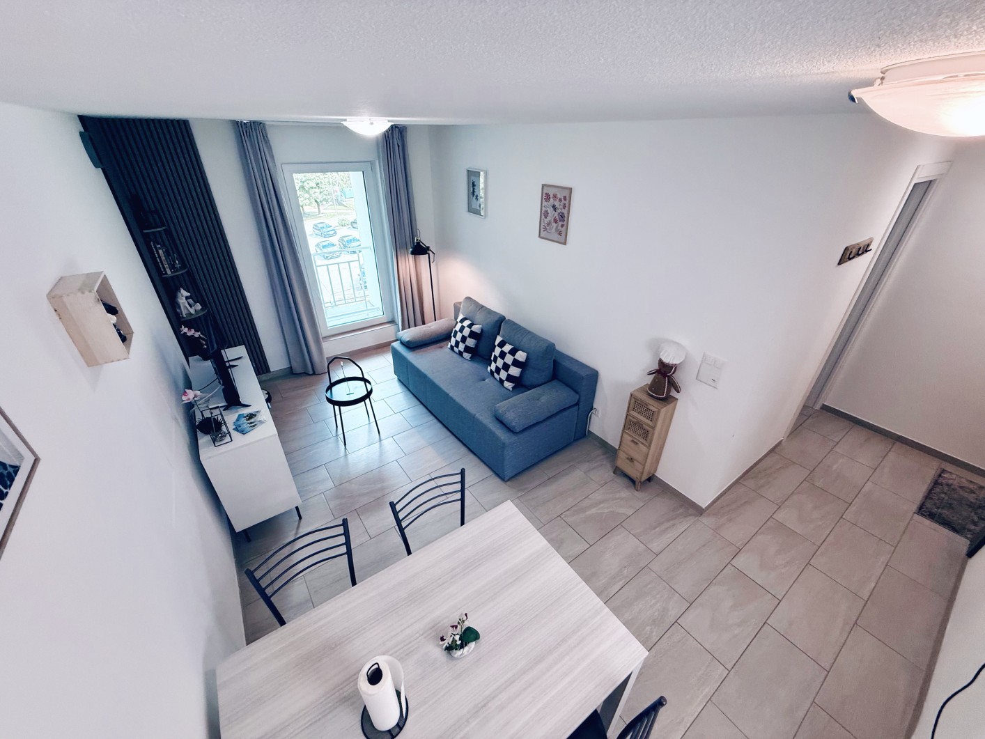 Der Hauptbereich verfügt über ein eingebautes Klappbett, das tagsüber unsichtbar bleibt und sich in ein praktisches Sofa verwandelt. Daneben befindet sich ein eleganter Wohnbereich mit einem gepolsterten Sofa und einem an der Wand montierten Flachbildfernseher, ideal zum Entspannen.