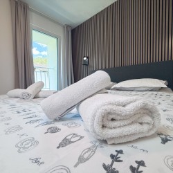 Dieses moderne Apartment mit Küche erstreckt sich über 48 Quadratmeter und bietet den Gästen eine großzügige und komfortable Umgebung. Der Raum umfasst ein Schlafzimmer mit einem Doppelbett sowie einem zusätzlichen Einzelbett und bietet somit flexible Übernachtungsmöglichkeiten.
